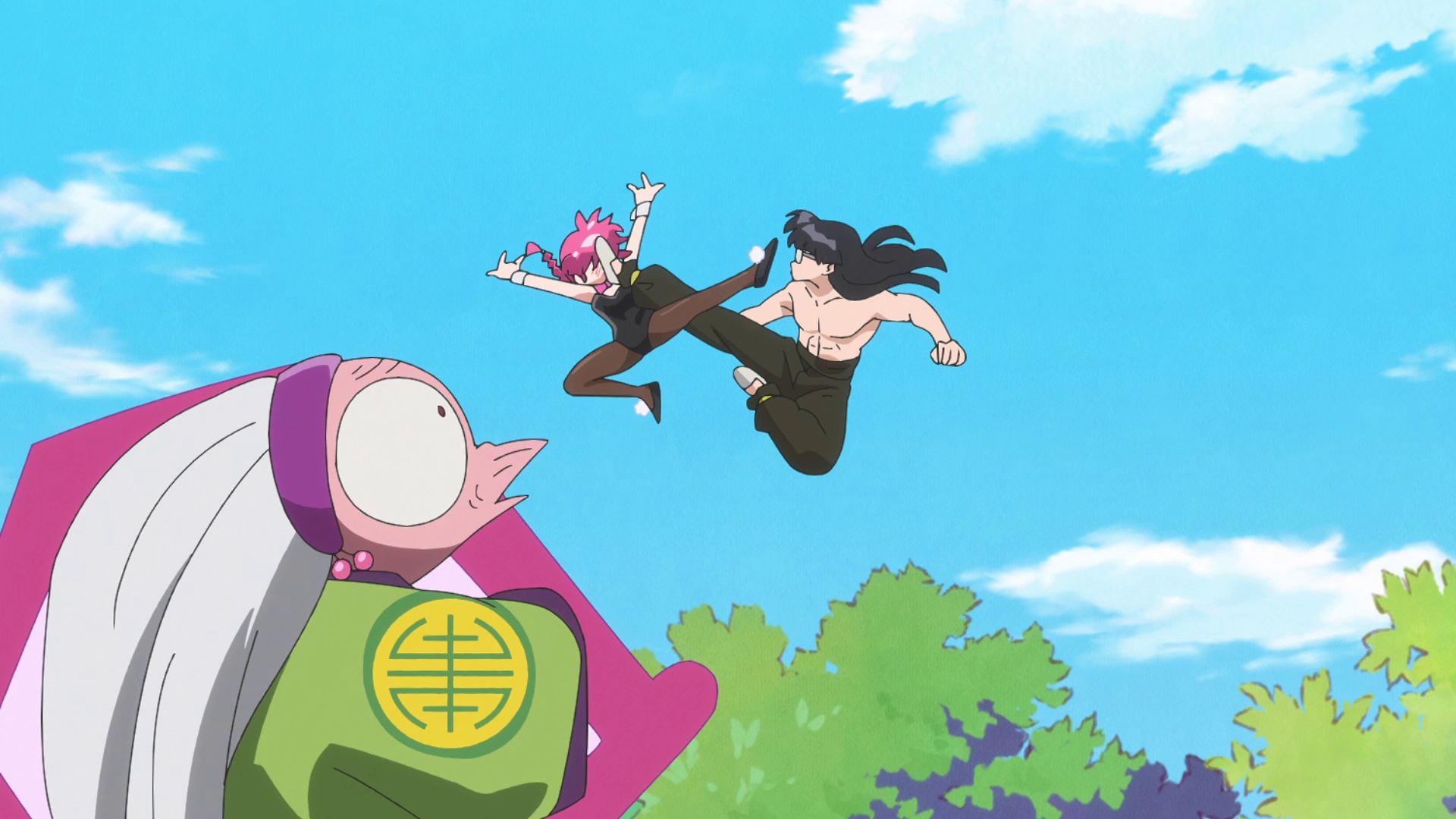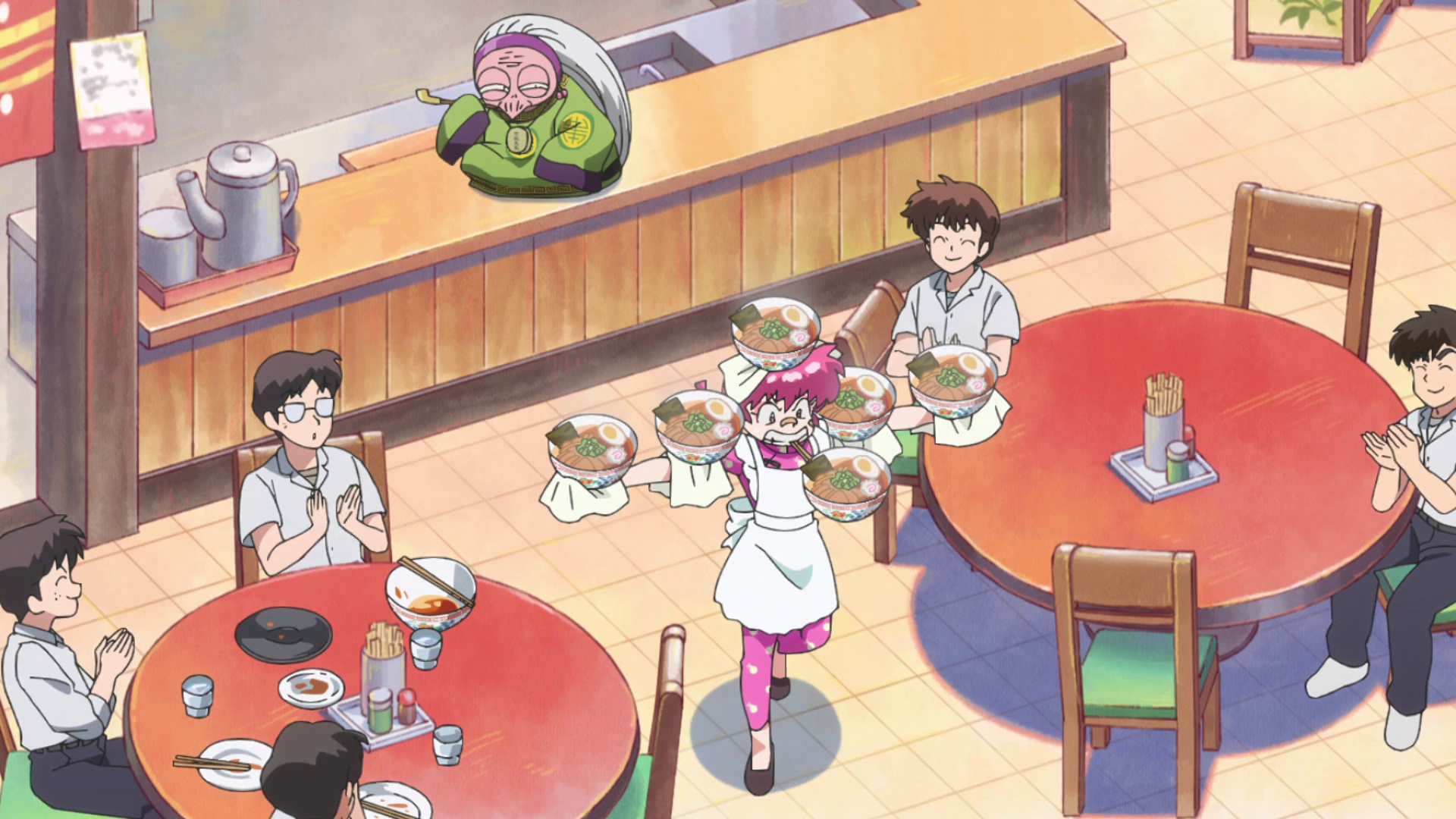 小茜与乱马忙着应付挥舞锅铲的未婚妻、变成家禽的对手,以及好色的武术大师,天道道场的混乱场面持续上演。